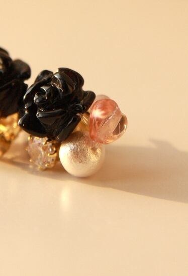 ブラックオニキスの薔薇のサイドにピーチ色のハートとホワイトコットンパール